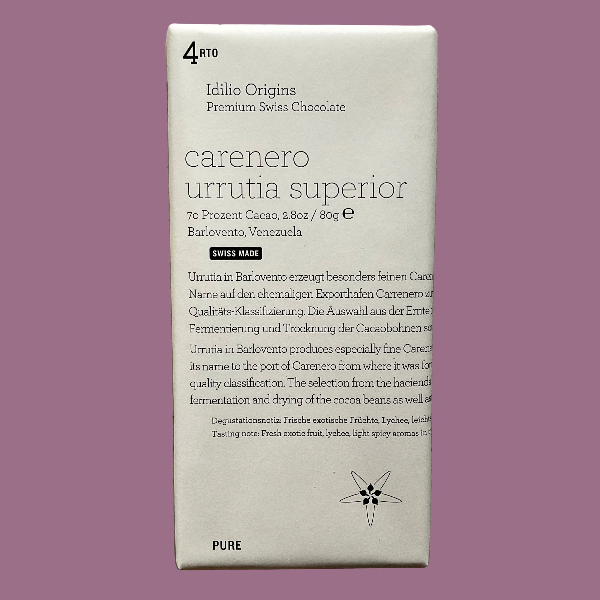 Urrutia in Barlovento, Venezuela produces exquisite, pure Carenero Superior, a Trinitario variety that is named for the port of Carenero from where it was originally exported. Superior is a historical quality classification. The selection of cacao beans from the hacienda harvest is expertly fermented and dried. The beans are then roasted, ground and conched to perfection in Switzerland and the result is this little masterpiece that I guarantee you’ll want to have as part of your chocolate stash!